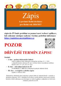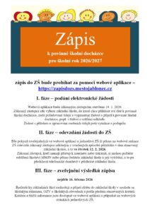 INFORMACE O ZÁPISU DO MATEŘSKÝCH ŠKOL V JABLONCI NAD NISOU – ZŘIZOVATEL MĚSTO 13. 1. 2026 https://zapisdozs.mestojablonec.cz/ Kategorie: Aktuálně Sdílet zprávu: